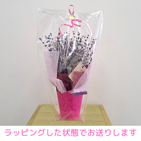 華やかなピンク色のポットが魅力的なシンプルなブーケです。